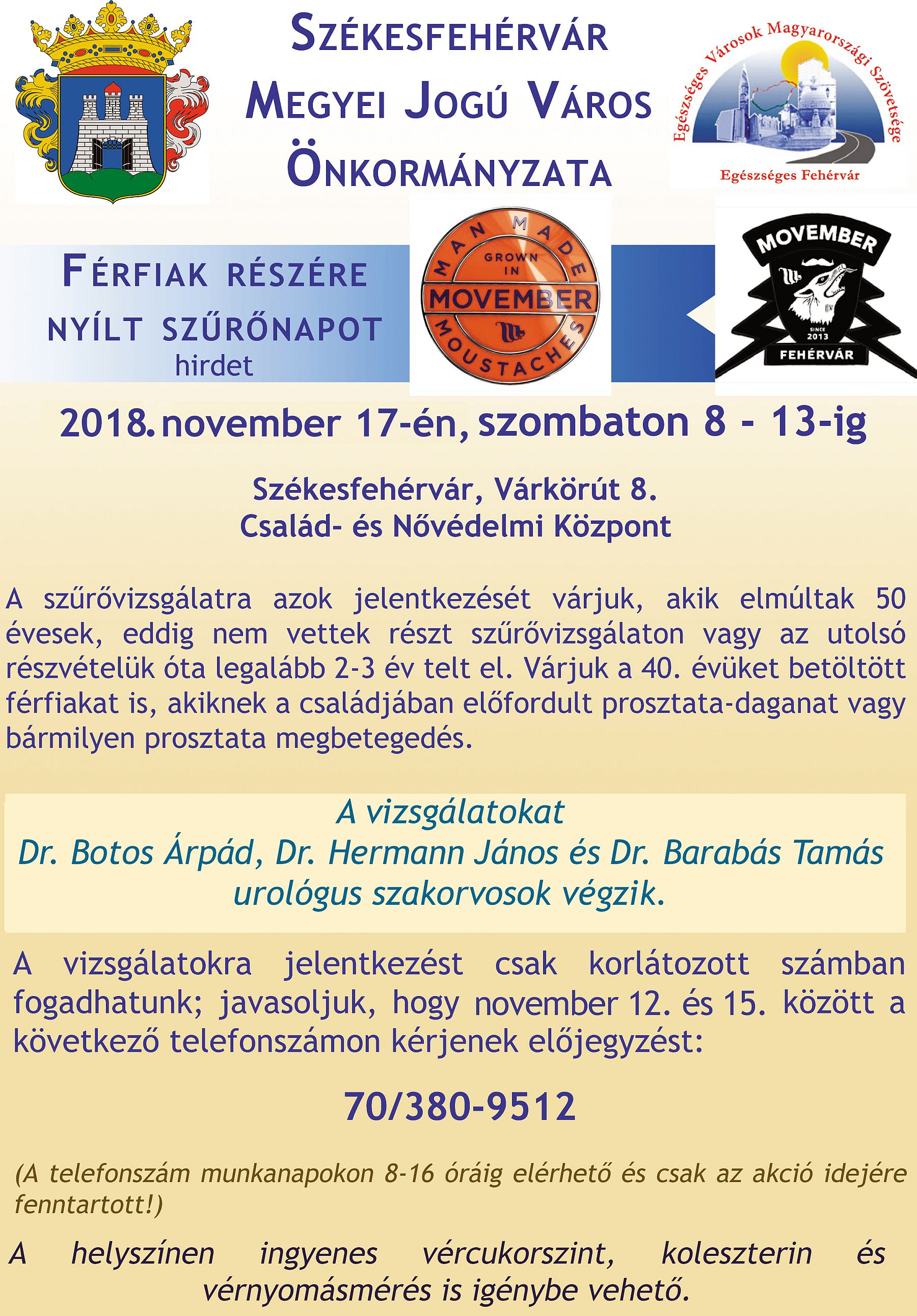 „Székesfehérváron hagyomány, hogy a férfiaknak szóló szűrőnapok egyikét novemberben tartjuk.” - hangsúlyozta a beharangozó sajtótájékoztatón Östör Annamária egészségügyi és sporttanácsnok, aki hozzátette: „a cél, hogy felhívjuk a férfiak figyelmét arra, hogy vegyenek részt a szűréseken, különösen akkor, ha az életkoruk és családtagjaik kórelőzménye indokolja."