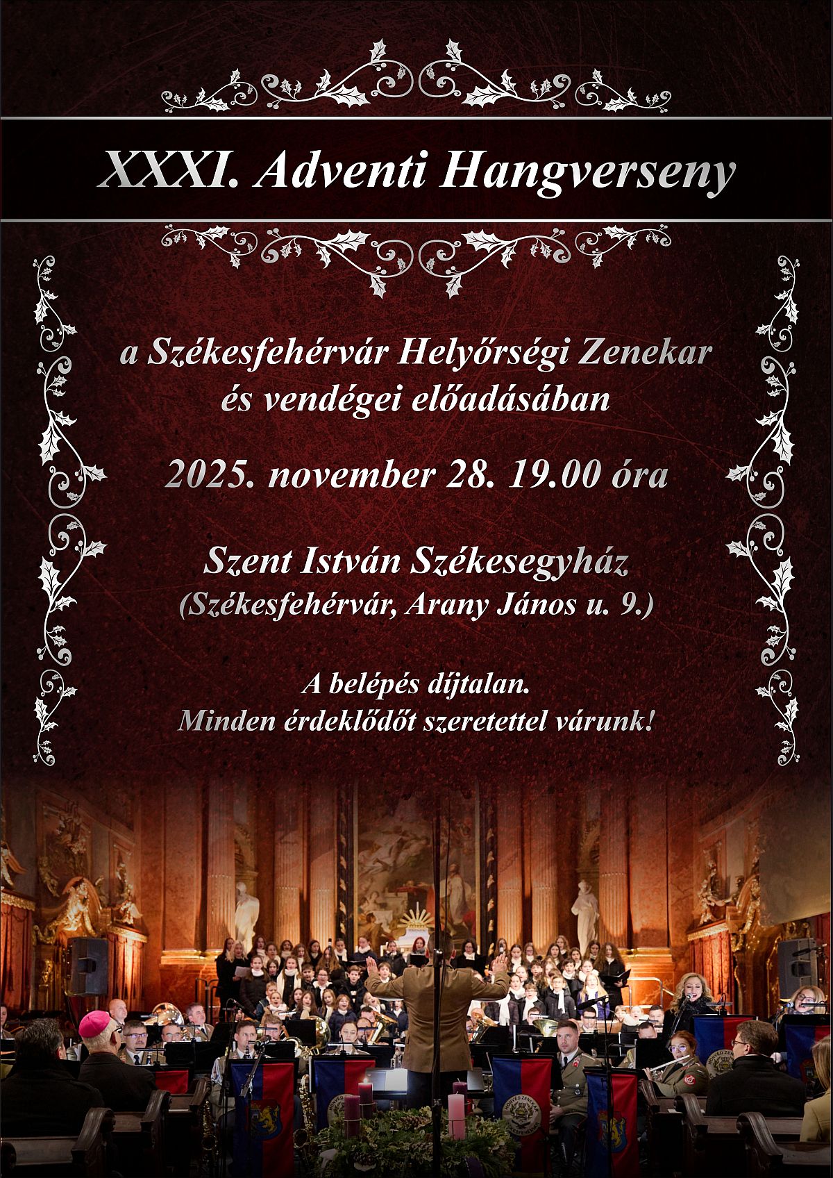 A harmincegyedik Adventi Koncertjére készül a Székesfehérvár Helyőrségi Zenekar, amelyet 2025. november 28-án,19:00 órai kezdettel rendeznek a Szent István Székesegyházban. Vezényel: Ruff Tamás őrnagy, a MH Nagysándor József 51. Híradó- és Vezetésbiztosító Dandár Székesfehérvár Helyőrségi Zenekar karmestere.