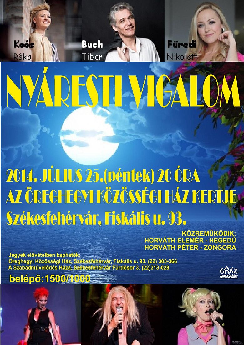 2014. július 25-én, pénteken este 20 órától Nyáresti Vigalom címmel rendeznek zenés programot az Öreghegyi Közösségi Ház kertjében. Az eseményen Koós Réka, Buch Tibor és Füredi Nikolett is fellépnek. Hegedűn Horváth Elemér, míg zongorán Horváth Péter működik közre. A Nyáresti Vigalomra 1500 és 1000 Forintos belépő megvásárlásával lehet bejutni. Jegyek elővételben kaphatók az Öreghegyi Közösségi Házban és A Szabadművelődés Házában is.
