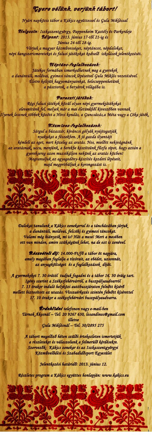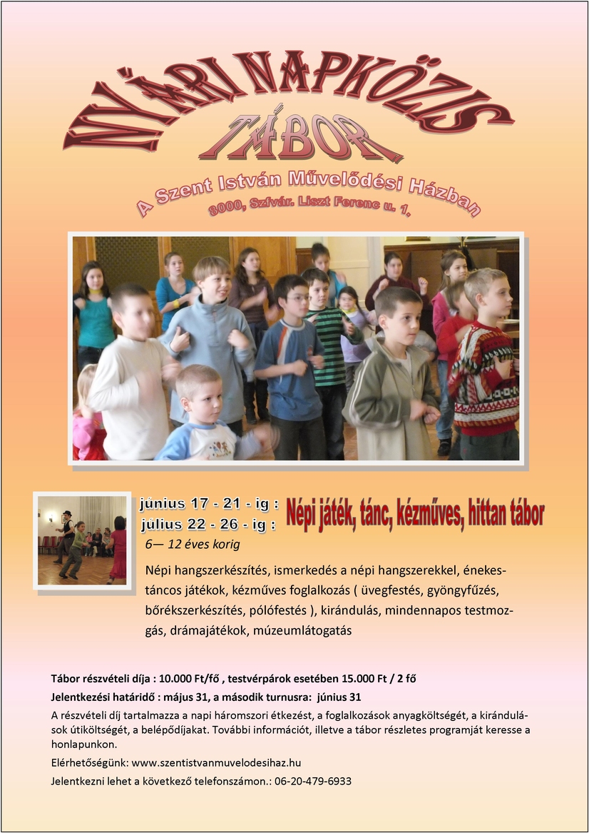 A Velencei-tavi Székesfehérvári Gyermek és Ifjúsági Tábor július 7-e és 12-e közötti I. turnusa a tehetségkutatásról szól. A "Csillag születik" táborba azokat várják, akik szeretnék kipróbálni és megmutatni tehetségüket az előadóművészet bármely területén. A július 14-19-e közötti II. turnusban Indián tábor zajlik, amely a prérin lakó népek életébe enged bepillantást, míg a július 21-26-a közötti III. turnusban, az erdélyi és csángó tábor-ban határon túlról érkező gyermekekkel ismerkedhetnek a táborozók a közös játék, a dal- és tánctanulás során, ezt a hetet egy közös fellépés zárja majd.