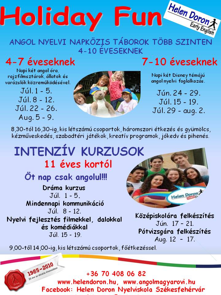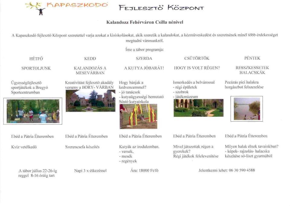 Számos színes, változatos és érdekes kikapcsolódási lehetőséget kínálnak az idei nyári táborok a gyerekeknek. A Napraforgó Városi Napközis Tábor július 1-jétől hat turnusban fogadja a táborozókat a Bregyó-közi Sportcentrumban, míg a Velencei-tónál zajló Székesfehéri Gyermek és Ifjúsági Tábor három turnusban, tematikus programokkal várja az iskolásokat. Ezen kívül számos egyesület, szervezet és intézmény szervez különféle táborokat.