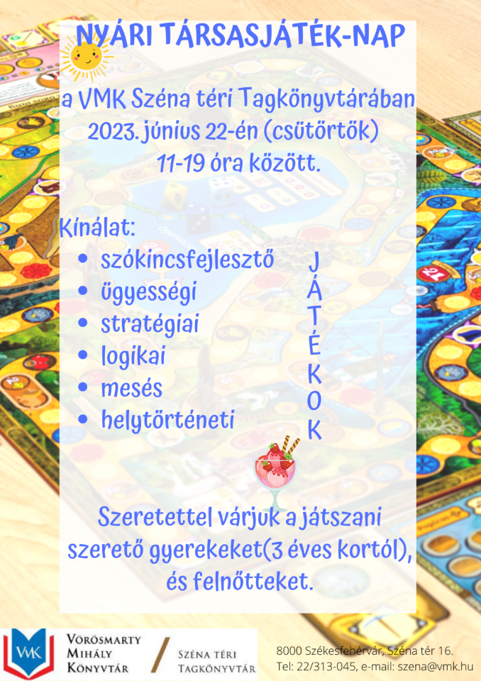 A nyári társasjáték-napra mindenkit szeretettel hívnak a Vörösmarty Mihály Könyvtár kollégái a Széna tér 16. szám alatti tagkönyvtárba!