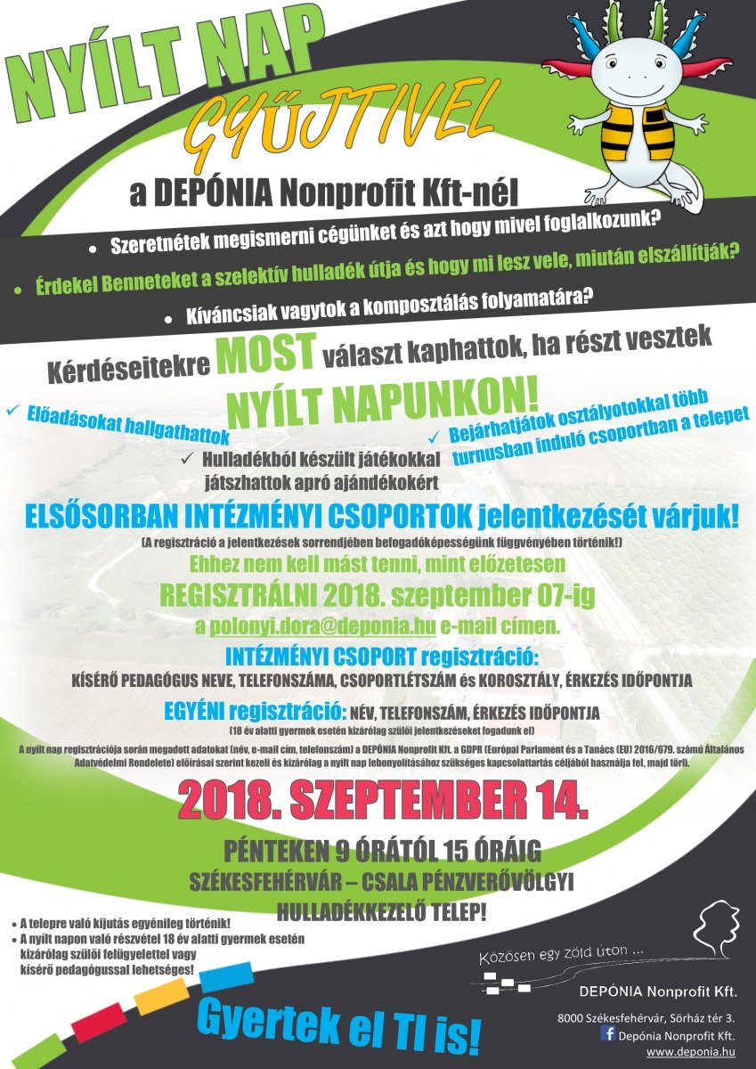 2018. szeptember 14., pénteken 9 órától 15 óráig bárki megnézheti mi történik az összegyűjtőtt hulladékunkkal Csalán. A program ingyenes, de előzetesen regisztrálni kell a polonyi.dora@deponia.hu címen!