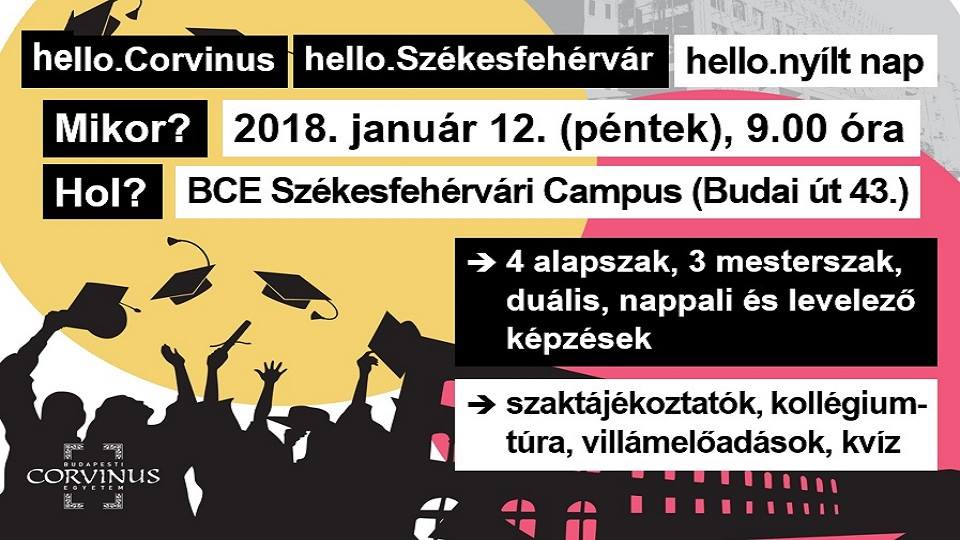 Hello.Corvinus, hello.Székesfehérvár, hello.nyílt nap! – a BCE folyamatosan fejlődő Székesfehérvári Campusán (Budai út 43.) január 12-én, pénteken 9 órától az induló négy alap- és három mesterszakról, a duális, a nappali és a levelezős képzésekről tudhatnak meg minden információt az érdeklődők.