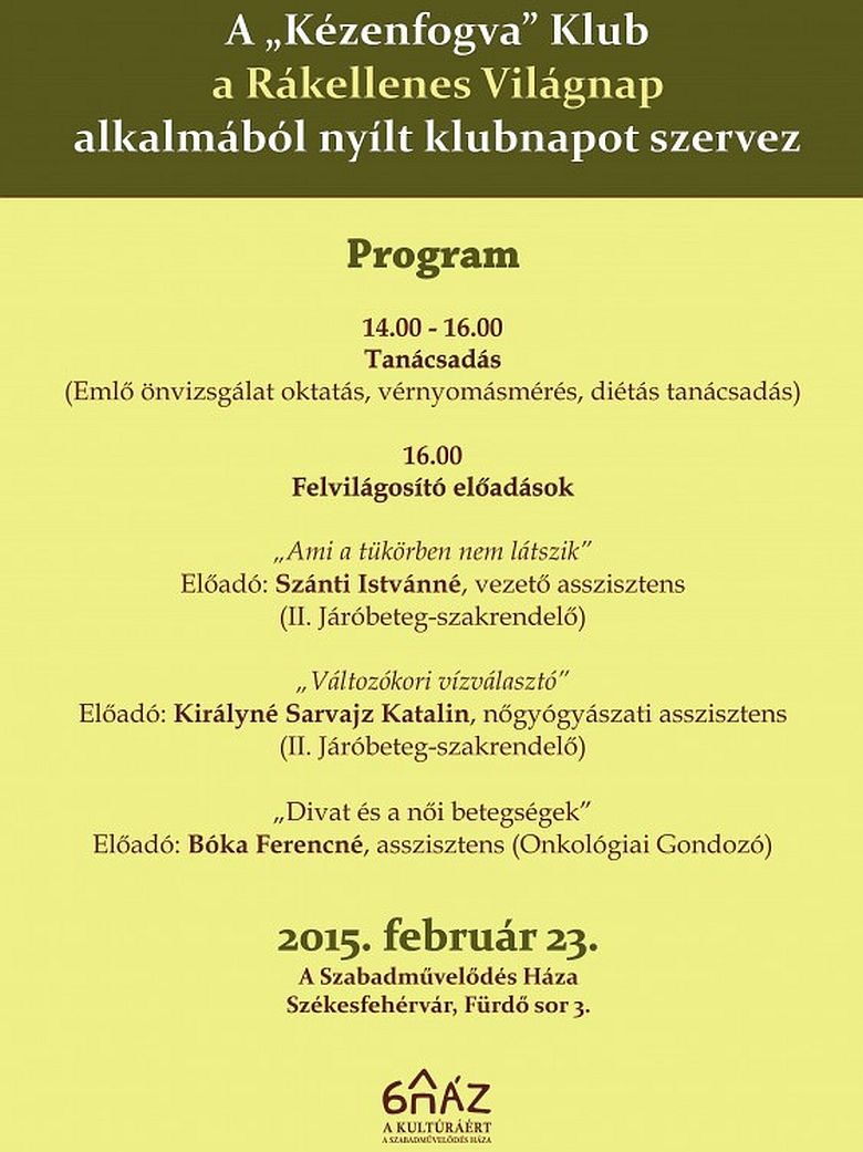 Hétfőn délután 14 órától a Rákellenes Világnap alkalmából nyílt napot szervez a "Kézenfogva" Klub A Szabad- művelődés Házában (Fürdő sor 3.). Az eseményen 14-től 16 óráig tanácsadással várnak mindenkit, melyben emlő önvizsgálat oktatás, vérnyomásmérés és diétás tanácsadás is szerepel. Ezután 16 órától felvilágosító előadásokkal várják az érdeklődőket.