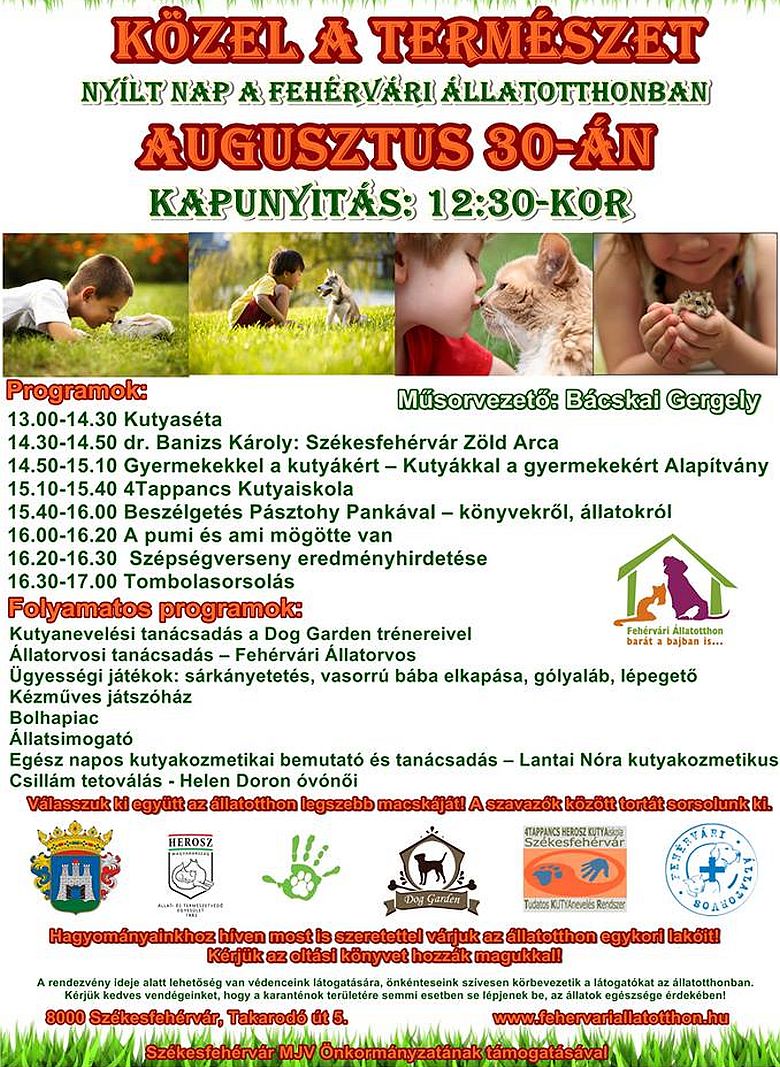 2015. augusztus 30-án, vasárnap a HEROSZ munkájával, valamint a Fehérvári Állatotthon mindennapjaival ismerkedhetnek meg az érdeklődők. Az eseményen játékos feladatok gyerekeknek, érdekes, tanulságos előadások, konzultációk felnőtteknek a felelős állattartás jegyében is szerepelnek a gazdag programkínálatban. A szervezők sok szeretettel várnak minden érdeklődőt a Fehérvári Állatotthonban szervezett eseményre.