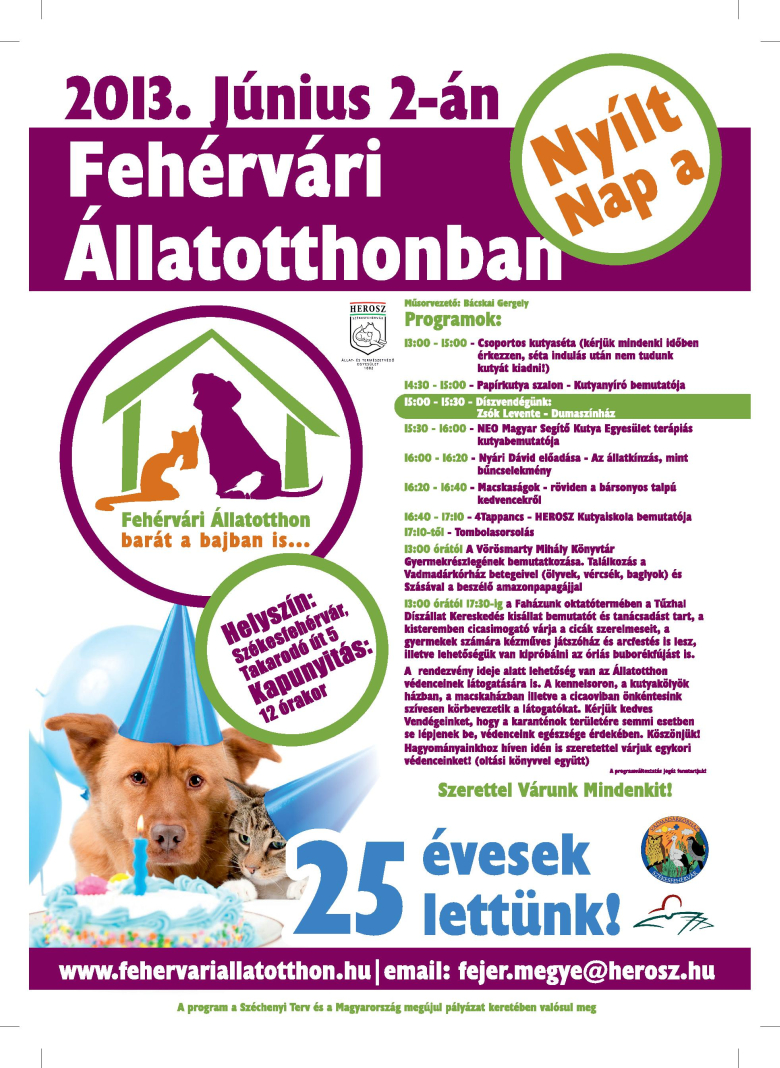 Krepsz Gyöngyi, a Fehérvári Állatotthon vezetője elmondta, hogy a HEROSZ Fejér Megyei Szervezete ezen a rendezvényen ünnepli megalakulásának 25. évfordulóját. A látogatók megismerkedhetnek az állatotthon és a Vadmadárkórház lakóival, betegeivel és a Gyermekkönyvtár munkájával is. A rendezvényen a 4Tappancs-HEROSZ kutyaiskola mellett lesz terápiás kutyabemutató, külön macskasarok és előadás a macskákról, díszállat bemutató és tanácsadás, kutyasétáltatás, látvány kutyakozmetika. Krepsz Gyöngyi hozzátette, hogy a kutyával érkező gazdik részére a rendezvény ideje alatt rendelkezésre áll az agility pálya, melyet kedvenceikkel kipróbálhatnak.