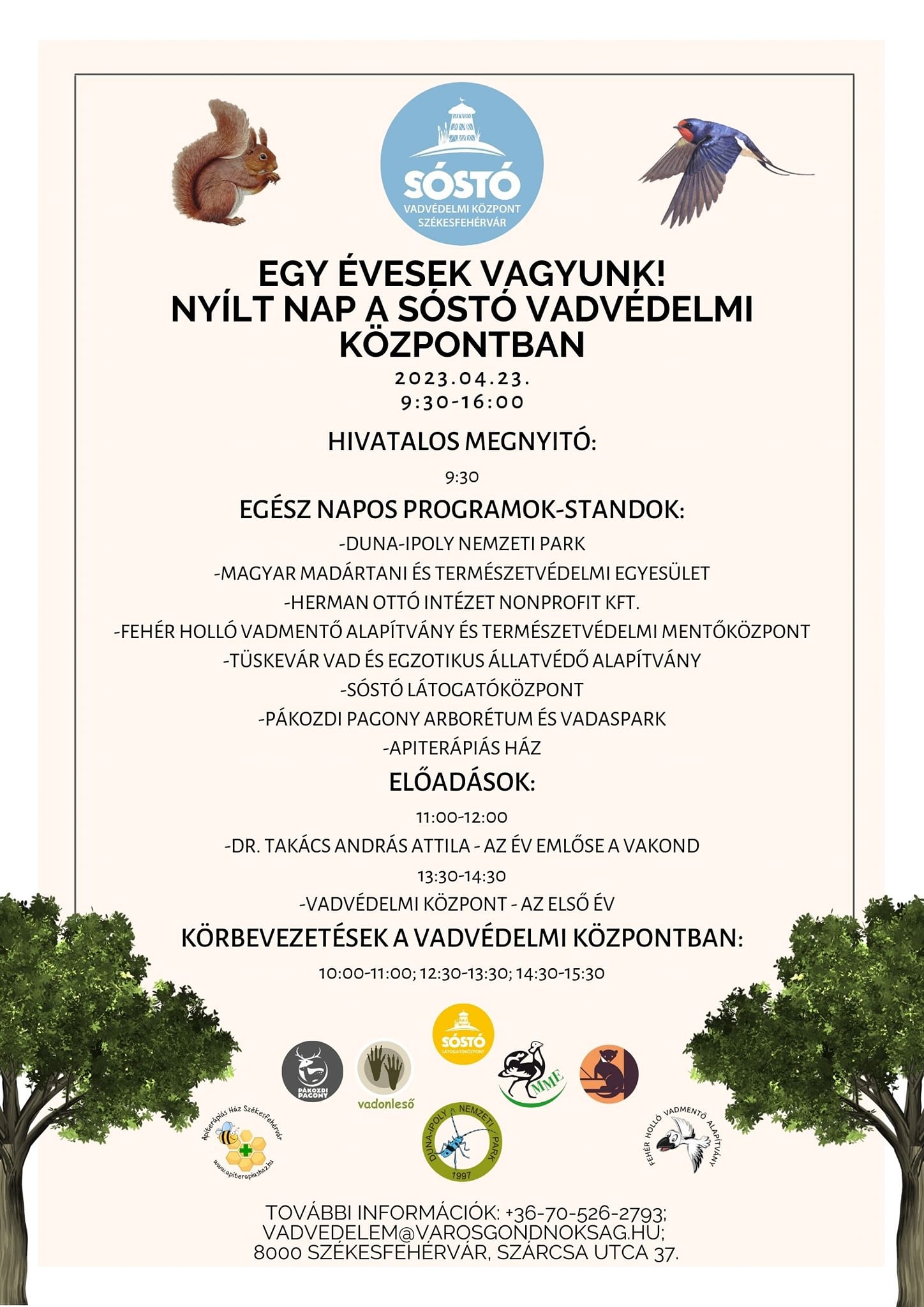 Április 23-án, vasárnap 9.30 órától egész napos rendezvénysorozattal ünneplik a Központ egyéves születésnapját. A programokhoz, standokhoz számos társszervezet és intézmény kapcsolódik, köztük a Duna-Ipolya Nemzeti Park, a Magyar Madártani és Természetvédelmi Egyesület, a Herman Ottó Intézet, a Fehér Holló Vadmentő Alapítvány és Természetvédelmi Mentőközpont, a Tüskevár Vad- és Egzotikus Állatvédő Alapítvány, a Sóstó Látogatóközpont, a Pákozdi Pagony Arborétum és Vadaspark, valamint az Apiterápiás Ház.
