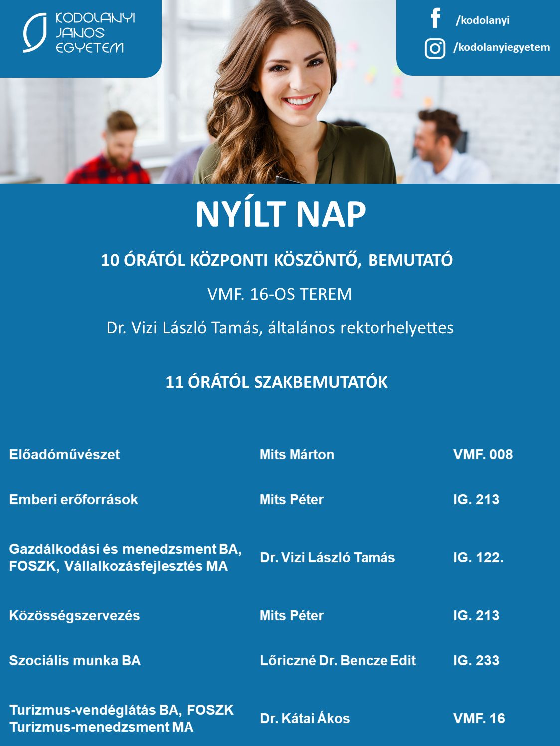 Nyílt napot tart 2019. február 9-én, szombaton a Kodolányi János Egyetem, Székesfehérváron a Fürdő u. 1. szám alatt. Az intézmény általános bemutatása mellett a fiatalok megismerhetik a színes egyetemi életet és a Kodolányi egyedülálló nemzetközi lehetőségeit is.