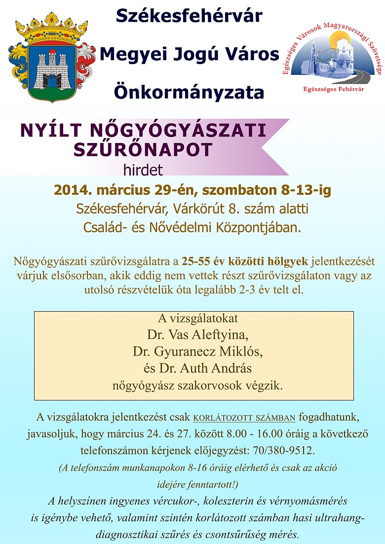 A nőgyógyászati szűrővizsgálatokra ezúttal elsősorban a 25-55 év közötti hölgyek jelentkezését várják. Március 29-én a vizsgálatokat a központ nőgyógyász szakorvosai, Dr. Vas Aleftyina, Dr. Gyuranecz Miklós és Dr. Auth András nőgyógyász szakorvosok végzik. Östör Annamária, Székesfehérvár egészségügyi és sporttanácsnoka elmondta, hogy hetedik alkalommal rendeznek nyílt nőgyógyászati szűrőnapot a városban, így egyre több fehérvári hölgy tud a lehetőségről, évről évre egyre többen érdeklődnek. A tanácsnok felhívta a figyelmet arra is, hogy akik már nem tudnak jelentkezni a jövő szombati szűrővizsgálatra, azok a Család- és Nővédelmi Központ elérhetőségein kérhetnek időpontot.