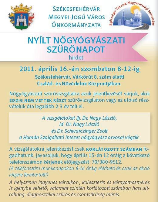 Székesfehérvár Megyei Jogú Város Önkormányzata nyílt nőgyógyászati szűrőnapot hirdet április 16-án, szombaton a Várkörút 8-as szám alatt. Olyan hölgyek jelentkezését várják, akik még soha nem voltak, vagy 2-3 éve vettek részt utoljára szűrővizsgálaton. Mivel csak korlátlan számban fogadnak el jelentkezést, a szervezők azt javasolják, hogy az érdeklődők április 15-ig regisztráljanak a 06-70/ 380-9512-es telefonszámon, a hívásokat 8 és 16 óra között várják a szervezők.