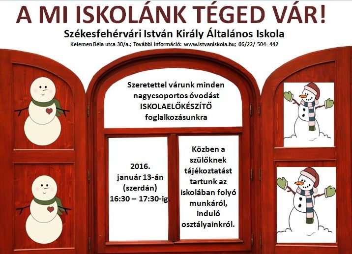 Az István Király Általános Iskolában január 13-án, szerdán 16.30 és 17.30 óra között zajlik „A mi iskolánk Téged vár!” című előkészítő foglalkozás a nagycsoportosok számára, közben a szülőknek tájékoztatót tartanak az intézményben folyó munkáról és az induló osztályokról.