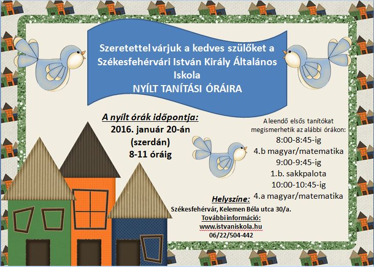 Több programot is szerveznek a leendő első osztályosok és családjaik számára az István Király Általános Iskolában. Január 13-án „A mi iskolánk Téged vár!” című délutánra a gyerekeket és szüleiket is várják, 20-án délelőtt nyílt tanítási órák lesznek több évfolyamon és időpontban, közben pedig hétfőn délutánonként folyamatosan zajlanak a nagycsoportosoknak szóló Sakkpalota foglalkozások.