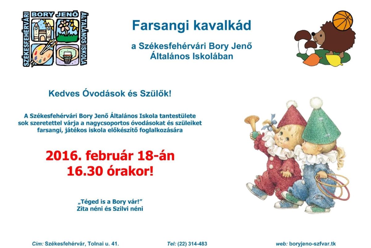 A Bory Jenő Általános Iskolában farsangi kavalkádot rendeznek február 18-án, csütörtökön 16.30 órától. A előkészítő foglalkozásra szeretettel várják a nagycsoportos óvodásokat és szüleiket.