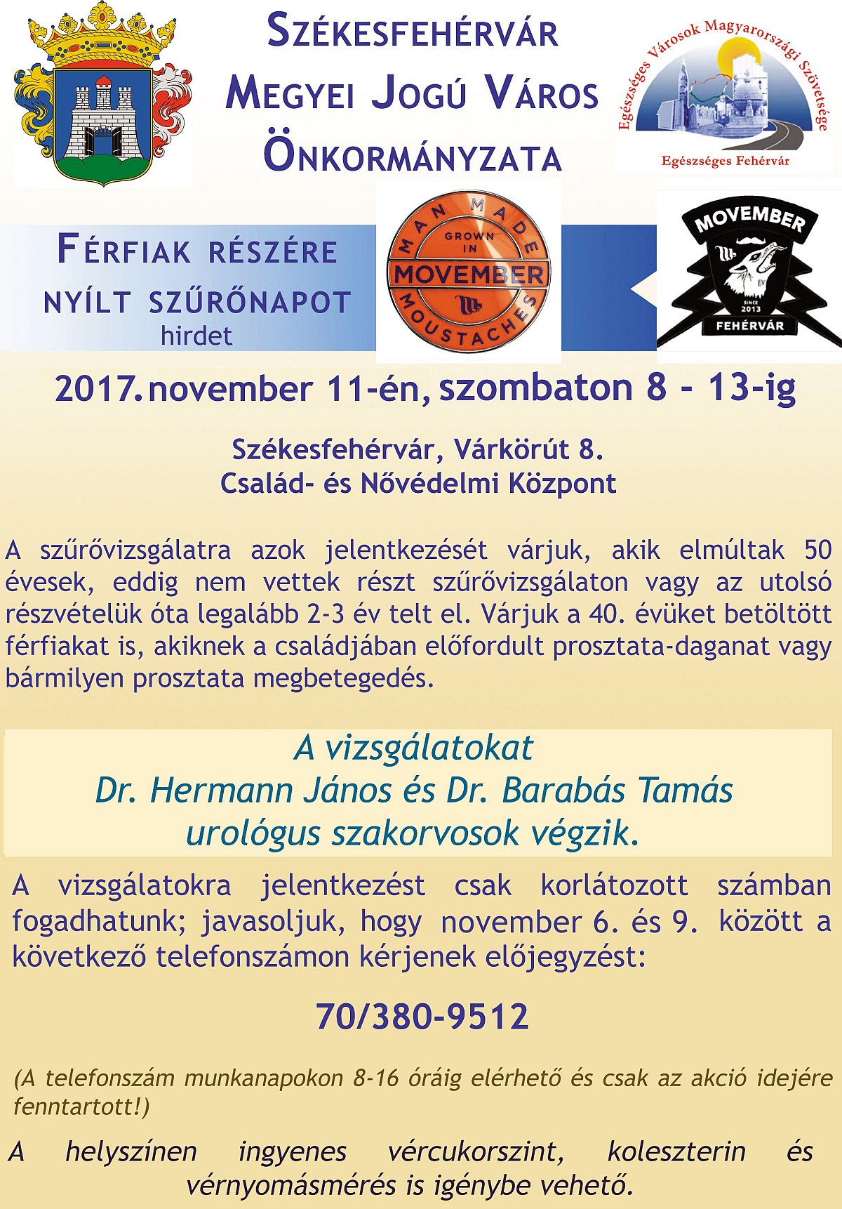 „Október hagyományosan a nők egészségvédelmének hónapja, míg a novembert a férfiaknak szenteljük. Ebben a hónapban rendezik meg világszerte az urak egészségvédelmét hangsúlyozó kezdeményezéseket, mint például a Movember-t is, melynek mottója: Növessz bajuszt, és ments meg egy manust! Székesfehérváron hagyomány, hogy a férfiaknak szóló szűrőnapok egyikét novemberben tartjuk.” - hangsúlyozta a beharangozó sajtótájékoztatón Östör Annamária egészségügyi és sporttanácsnok. Kiemelte, arra nincs mód, hogy a város teljes férfi lakosságát megvizsgálják. Kifejezett cél azonban felhívni a férfiak figyelmét arra, hogy felelősek saját egészségükért, és fontos, hogy részt vegyenek a szűréseken, különösen, ha azt az életkoruk és családtagjaik kórelőzménye indokolja. „A férfiak nagyon fontos szerepet töltenek be a családjaink és a társadalmunk életében. Kérjük, engedjék meg, hogy vigyázzunk rájuk, és segítsünk nekik! Szeretettel várjuk őket jövő szombaton a Család- és Nővédelmi központban!” – zárta gondolatait Östör Annamária.
