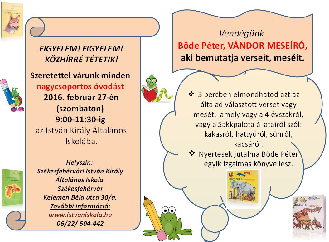 Február 27-én, szombaton 9.00-11.30 óra között Böde Péter vándor meseíró lesz az intézmény vendége, aki bemutatja verseit és meséit. Ezen a napon versenyt is szerveznek a nagycsoportos óvodásoknak és az iskola alsó tagozatosainak. A gyerekek három percben elmondhatnak egy általuk választott verset, vagy mesét, amely a négy évszakról, illetve a Sakkpalota programhoz köthető valamely állatról – a kakasról, a hattyúról, a sünről, vagy a kacsáról – szól. Azon gyermekek figyelmére is számítanak, akik a versenyen nem kívánnak részt venni, de szeretik a meséket és szívesen eltöltenének egy délelőttöt kedvenc mesefiguráikkal.
