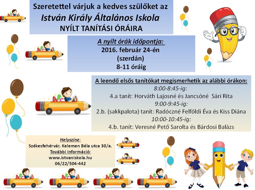Három időpontban tartanak nyílt tanítási órákat február 24-én, szerdán az István Király Általános Iskolában. 8.00 órától a 4.a, 9.00 órától a Sakkpalota módszert bemutató 2.b, végül 10.00 órától a 4.b osztályban folyó munkát kísérhetik figyelemmel a szülők, és ismerkedhetnek meg a leendő elsős tanító nénikkel.
