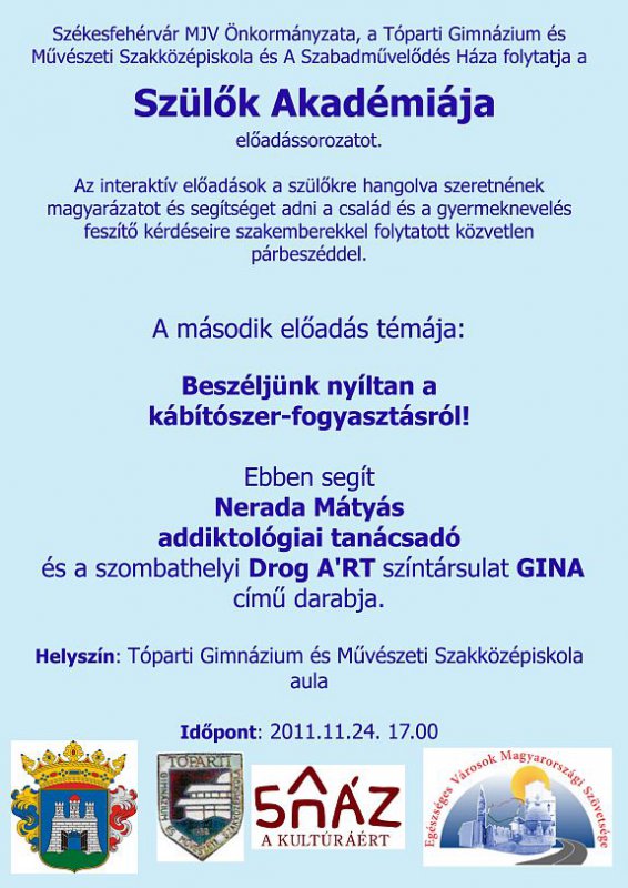 Beszéljünk nyíltan a kábítószer-fogyasztásról címmel folytatódik november 24-én a Szülők Akadémiája Székesfehérváron, a Tóparti Gimnáziumban. Az elődássorozatot Székesfehérvár Önkormányzata, a Tóparti Gimnázium és Művészeti Szakközépiskola, valamint A Szabadművelődés Háza közösen, hagyományteremtő szándékkal szervezte. A második előadáson részt vesz Nerada Mátyás addiktológiai tanácsadó és fellép a szombathelyi Drog A'RT színtársulat Gina című darabjával.