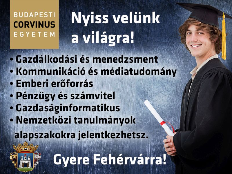 A Budapesti Corvinus Egyetem hat alapszakon indítja el székesfehérvári képzéseit: emberi erőforrások, nemzetközi tanulmányok, kommunikáció és médiatudomány, gazdaságinformatika, továbbá gazdálkodás és menedzsment, illetve pénzügy és számvitel szakon a Budai út 43. szám alatti székesfehérvári campusban. Aki a Polgármesterei Hivatalban szeretné a pénzügy -számviteli szakmai duális képzési gyakorlatát eltölteni, annak március 16-ig kell jelentkeznie.