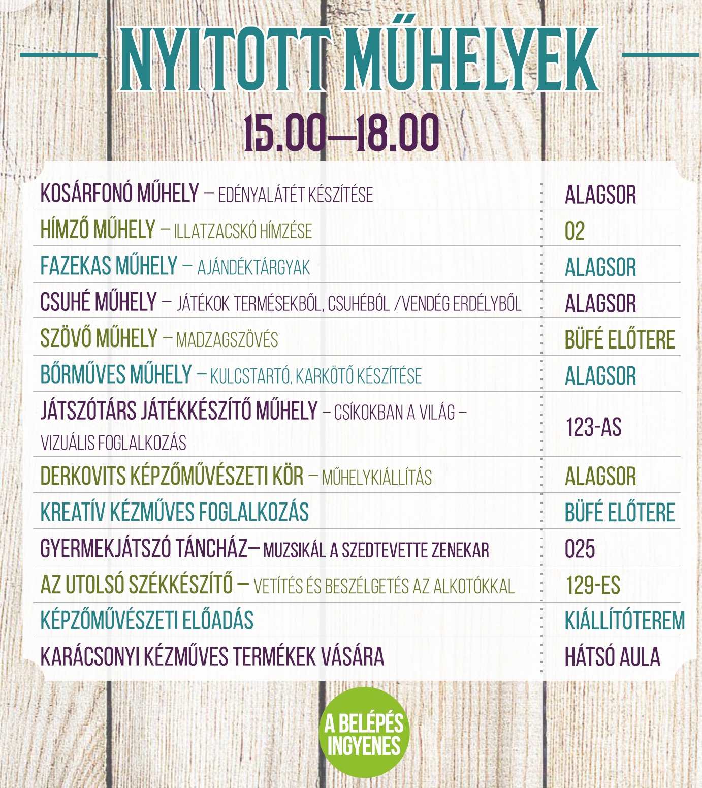 15.00 órakor nyílnak meg a műhelyek kapui: a kosárfonó-, hímző-, fazekas-, csuhé-, szövő- és bőrműves műhelyben, valamint a Játszótárs Játékkészítő Műhelyben kezdetét veszi kézműves programsorozatunk, ahol a családok közösen készülhetnek fel a karácsonyra. Az általuk készített karácsonyi tárgyakat haza is vihetik.