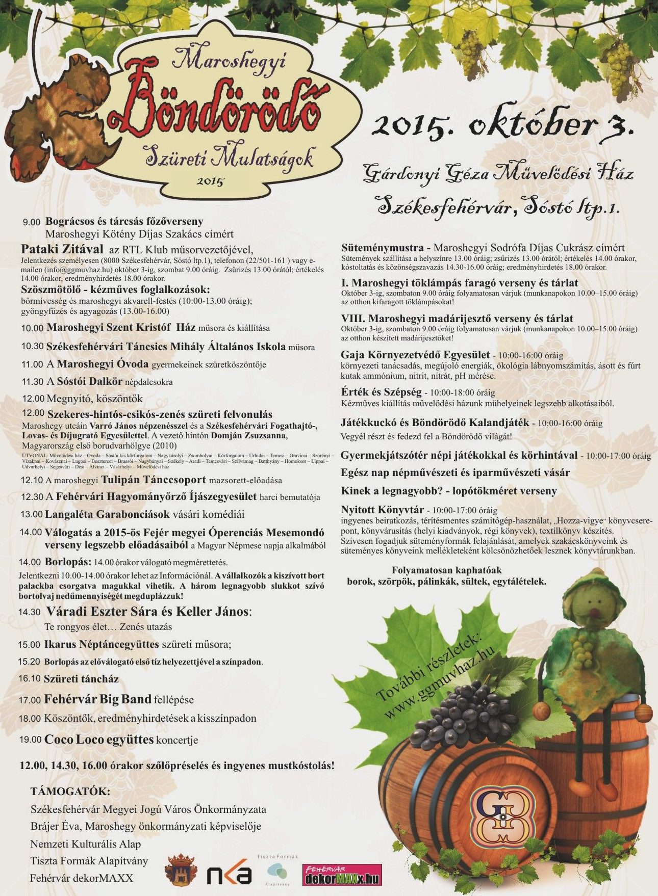 Nyolcadik alkalommal rendezik meg október 3-án, szombaton Maroshegy népszerű szüreti mulatságát, a Maroshegyi Böndörödőt. A rendezvény elsődleges célja, hogy megidézze, és minden generációval megismertesse a hangulatos szüreti hagyományokat. Az érdeklődőket idén is különböző színes programok várják a Gárdonyi Géza Művelődési Ház előtti téren.