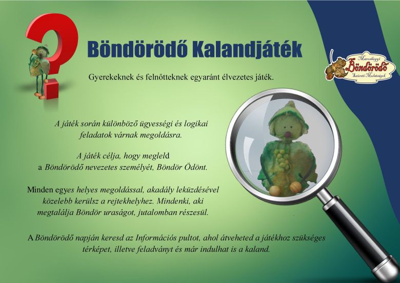 Érdemes lesz végigsétálni az összes helyszínen, mind a Gárdonyi Géza Művelődési Ház és Könyvtár előtti területen, mind az épületben, ahol többek között kiállításokkal is várják az érdeklődőket. A séta ugyanis nemcsak az egészséget szolgálja, hanem kalandot is ígér! Az egyéni vagy csapatban induló gyerekek, felnőttek, családok feladata az lesz, hogy ügyességi és logikai feladatokat megoldva felfedezzék a Böndörödő világát, és észrevegyék Böndör Ödönt! A szervezők ígérete szerint mindenki, aki megtalálja Böndör uraságot, jutalomban részesül.