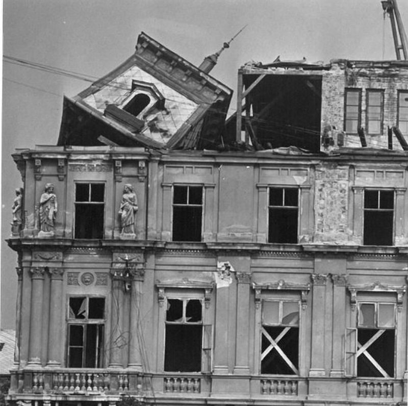 A Vörösmarty tér egyik jellegzetes háza is lakhatatlanná vált a II világháborúban.