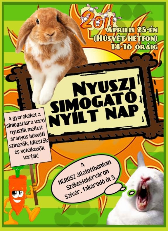 Nem múlthat el családi program nélkül a húsvéti ünnepkör a székesfehérvári Herosz Állatotthonban. Az idén tizenkilenc éves fennállását ünneplő, Takarodó úti létesítmény az elmúlt tíz évben mindig megrendezte az eseményt. A Nyuszisimogató főként azoknak a családoknak jelent könnyebbséget, akik nem tudnak vagy nem kívánnak otthonukban állatot tartani, de mégis szeretnék megörvendezteti a gyerekeket. Az állatotthon április 25-én, 14.00 órától 16.00 óráig fogadja a látogatókat.