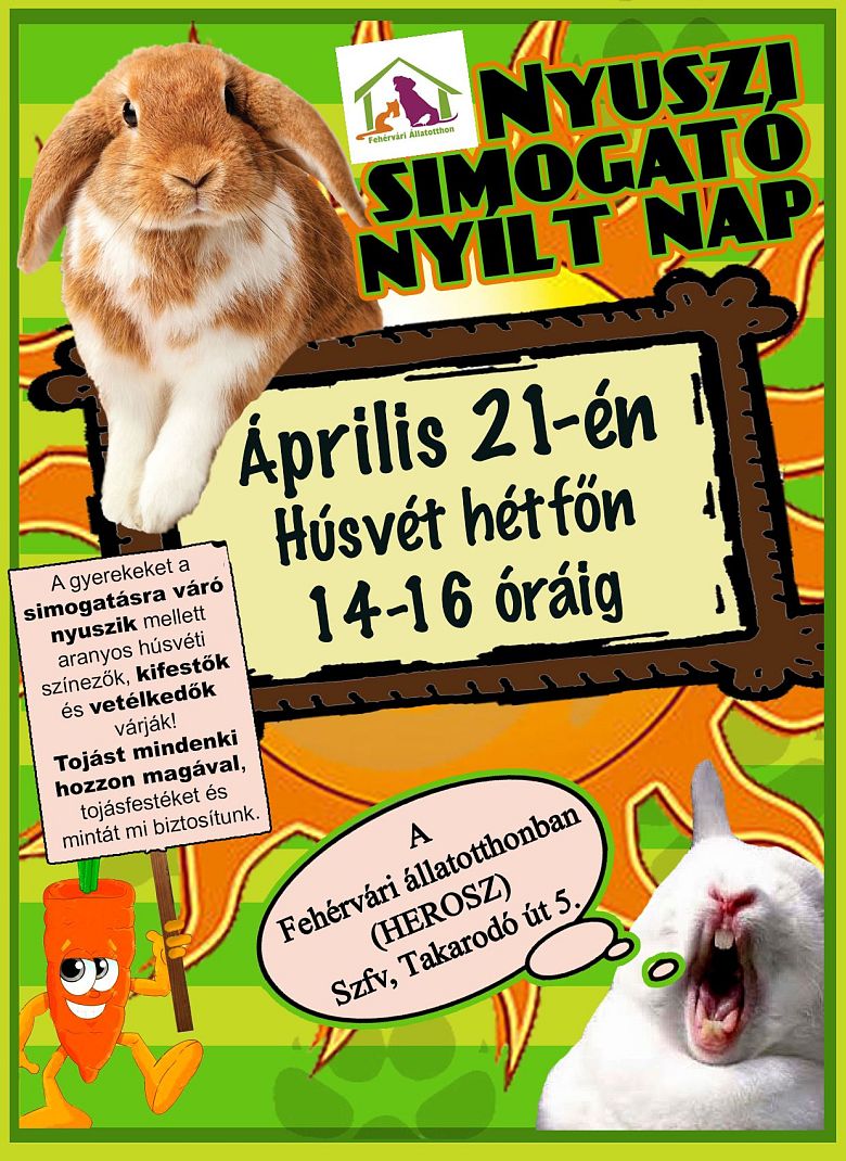 A HEROSZ Állatotthon azoknak a családoknak szeretne segíteni, akik nem tudnak, vagy nem szándékoznak a gyermekeiknek élő állatot vásárolni az ünnepekre, ám mégis szeretnék megörvendeztetni a kicsiket. Április 21-én, húsvét hétfőn 14.00 és 16.00 óra között rendezik meg a hagyományos nyuszisimogatót. Biztonságos, ellenőrzött körülmények között lehet megtekinteni és megérinteni az állatokat, ezen kívül húsvéti színezőkkel, kifestőkkel, és vetélkedőkkel várják a gyerekeket. Lehet tojást festeni, melyhez a tojást a vendégeknek kell magukkal hozniuk, a festékeket és a mintákat a szervezők biztosítják.