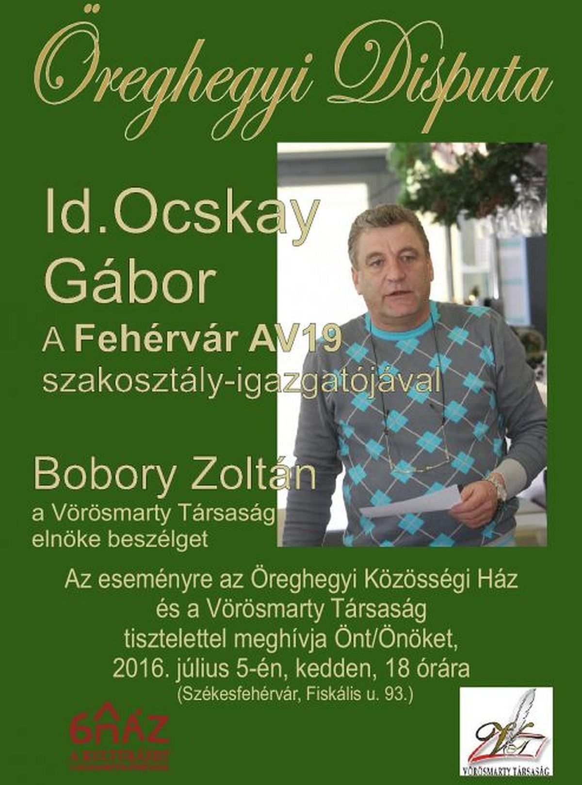 Minden sportot kedvelőt, jégkorongért rajongót szeretettel invitálnak az Öreghegyi Közösségi Házba július 5-én, kedden 18 órára, ahol ezúttal a disputa id. Ocskay Gábor és a házigazda Bobory Zoltán közt zajlik majd. Az igazán érdekesnek és izgalmasnak ígérkező beszélgetős estre – melyen író kontra sportoló összecsapás várható – mindenkit szeretettel várnak!