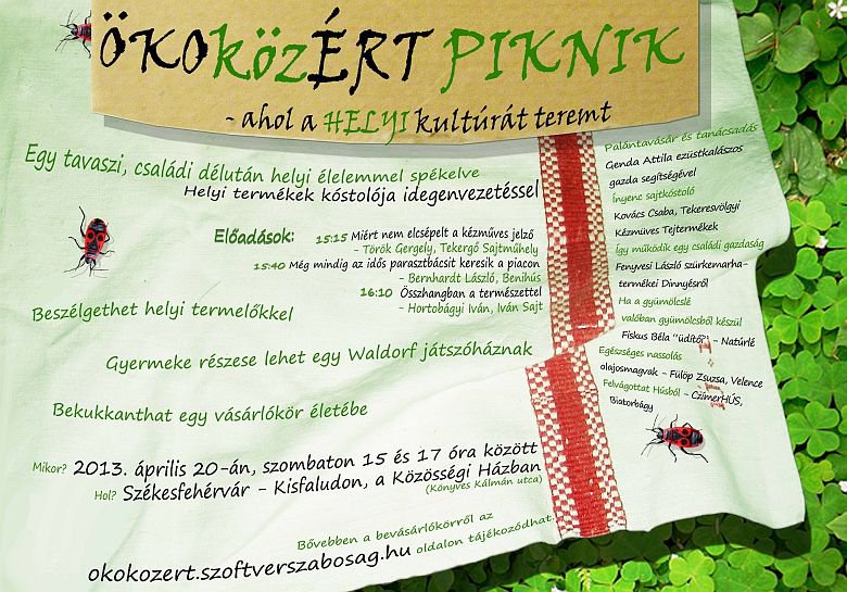 Ahol a HELYI kultúrát teremt mottóval szerveznek ÖKOKÖZÉRT Pikniket április 20-án, jövő héten szombaton a Kisfaludi Közösségi Házban. A helyi termékek kóstolója mellett a Székesfehérvár környéki termelők előadásaival próbálják felhívni az emberek figyelmét a helyi gazdaság élénkítésének hétköznapi lehetőségeire. A részvétel ingyenes, a szervezők mindenkit szeretettel várnak!