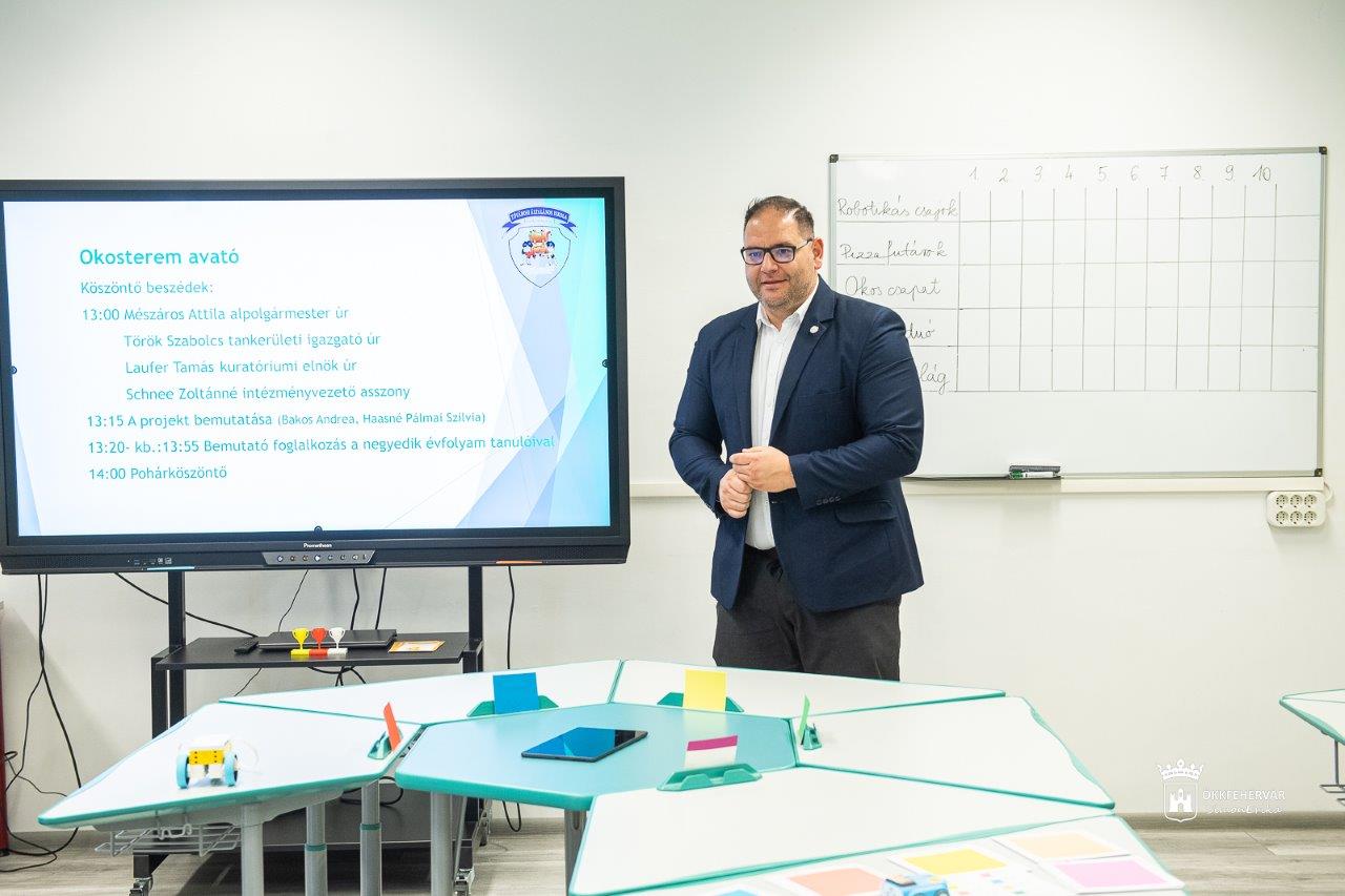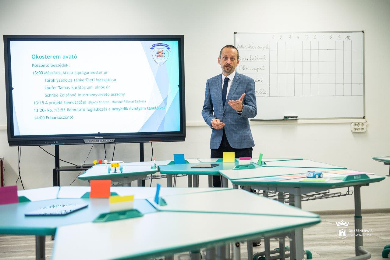 Mészáros Attila alpolgármester a köszöntőjében kiemelte: az oktatás fejlődésének egyik záloga, hogy minél hatékonyabban fejlesszük a fiatalok digitális tudását. Ma már a frontális oktatás mellett olyan tantermet is ki tudunk alakítani, ahol a csoportmunka és a kreatív gondolkodás a lényeg. Erre kiváló lehetőséget nyújt az okos tanterem Székesfehérvár legnagyobb általános iskolájában. A fiatalokban fejlődnek és megerősödnek azok a készségek, melyekre a mai iparban abszolút szükség van.