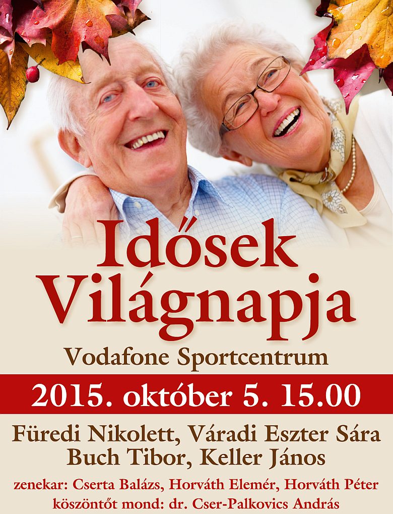Székesfehérvár Önkormányzata ünnepi műsorral kedveskedik az idősek világnapja alkalmából a szépkorúaknak. A Vodafone Sportcentrumban október 5-én, hétfőn 15.00 órára várnak minden kedves érdeklődőt a szervezők. Az esten Füredi Nikolett, Váradi Eszter Sára, Buch Tibor és Keller János ad zenés műsort Cserta Balázs, Horváth Elemér és Horváth Péter közreműködésével. Az ünnepségen dr. Cser-Palkovics András polgármester mond köszöntőt.