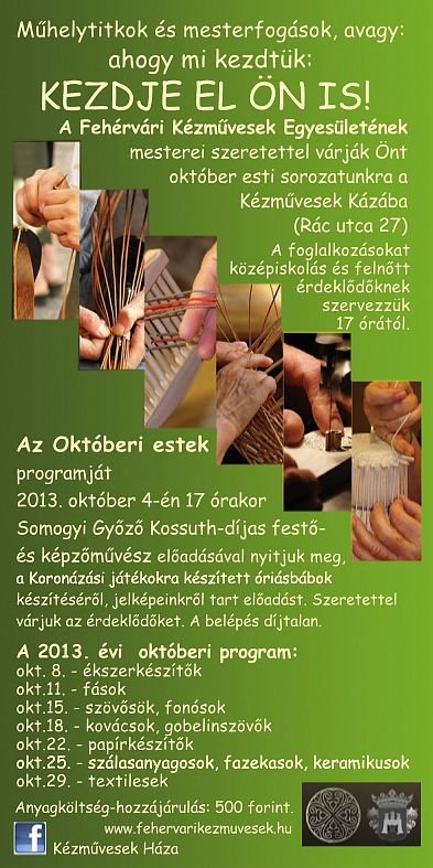 A már hagyományossá vált – a kézműves szakmákba mélyebb betekintést lehetővé tévő - kedd és péntek délutáni foglalkozásokat Somogyi Győző Kossuth-díjas festő és képzőművész előadásával nyitják meg október 4-én, 17.00 órakor a Rác utcai Kézművesek Házában. Somogyi Győző a fehérváriak számára ismert alkotó, ő álmodta meg többek között a Koronázási Ünnepi Játékokon látott óriásbábokat. Pénteken az alkotó munkáról, a szereplők szín- forma- és mintavilágáról, ezek jelentéseiről és történelmi vonatkozásairól számol be a hallgatóknak.