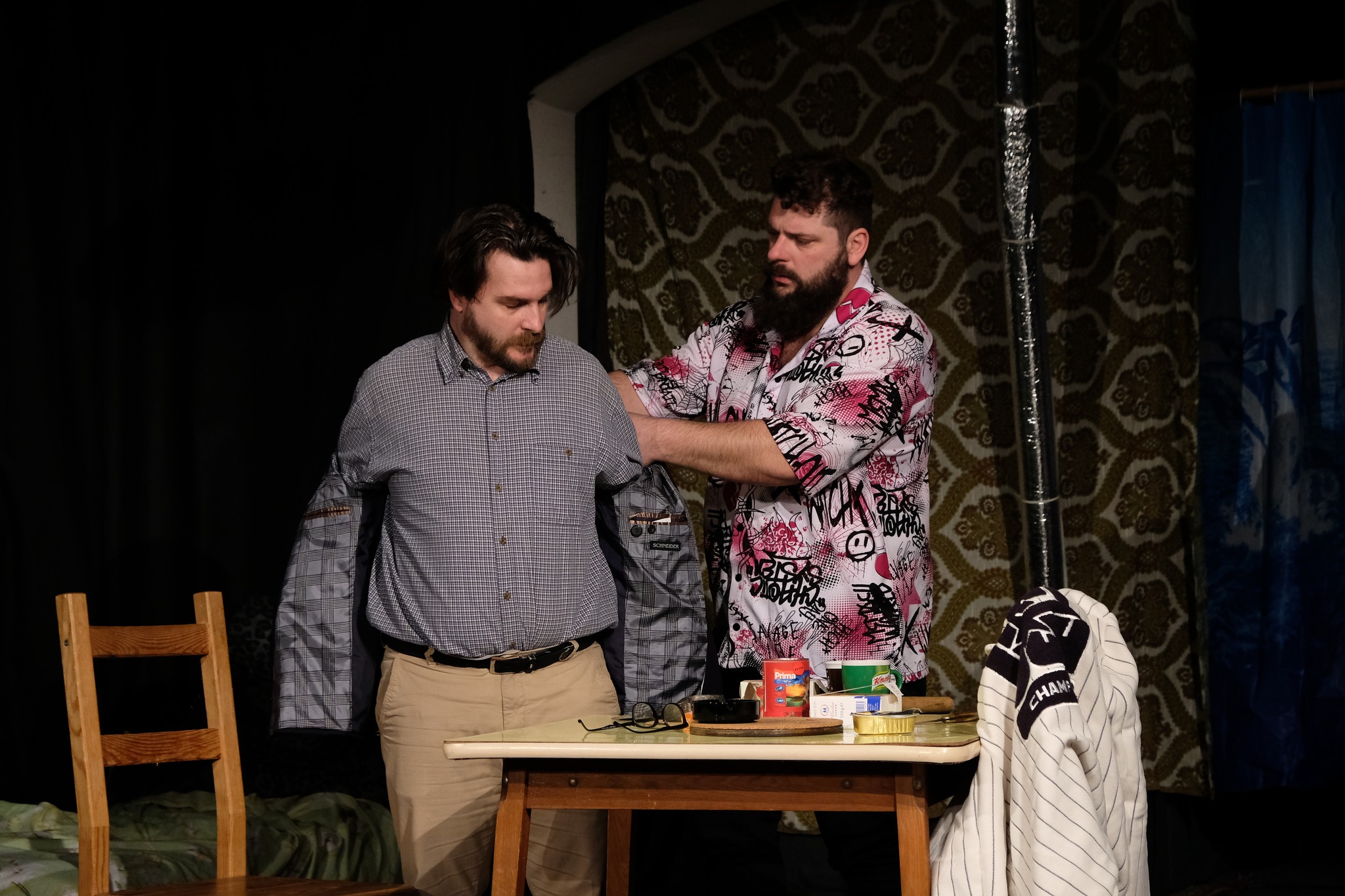 A műből készült előadás egy olcsó külföldi albérlet szűk pince szobájában egymás mellé kényszerült két fiatal férfi életébe, vágyaiba enged közeli bepillantást.