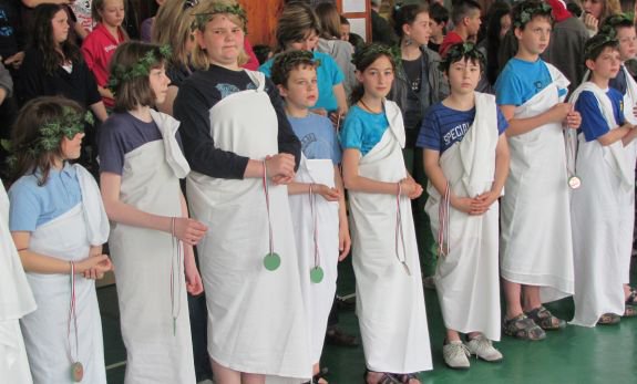 Az ünnepélyes külsőségek az eredményhirdetésnél sem maradtak el, a görögök viseletét mintázta az éremátadók jelmeze, volt babérkoszorú is az érmek mellé. A sorverseny díjátadását a szellemi olimpia eredményhirdetése követte - az iskola szinte valamennyi tanulója érintett volt az olimpiai nap programjaiban. A vetélkedőket egészséges életmóddal kapcsolatos tanácsadások, mérések egészítették ki.