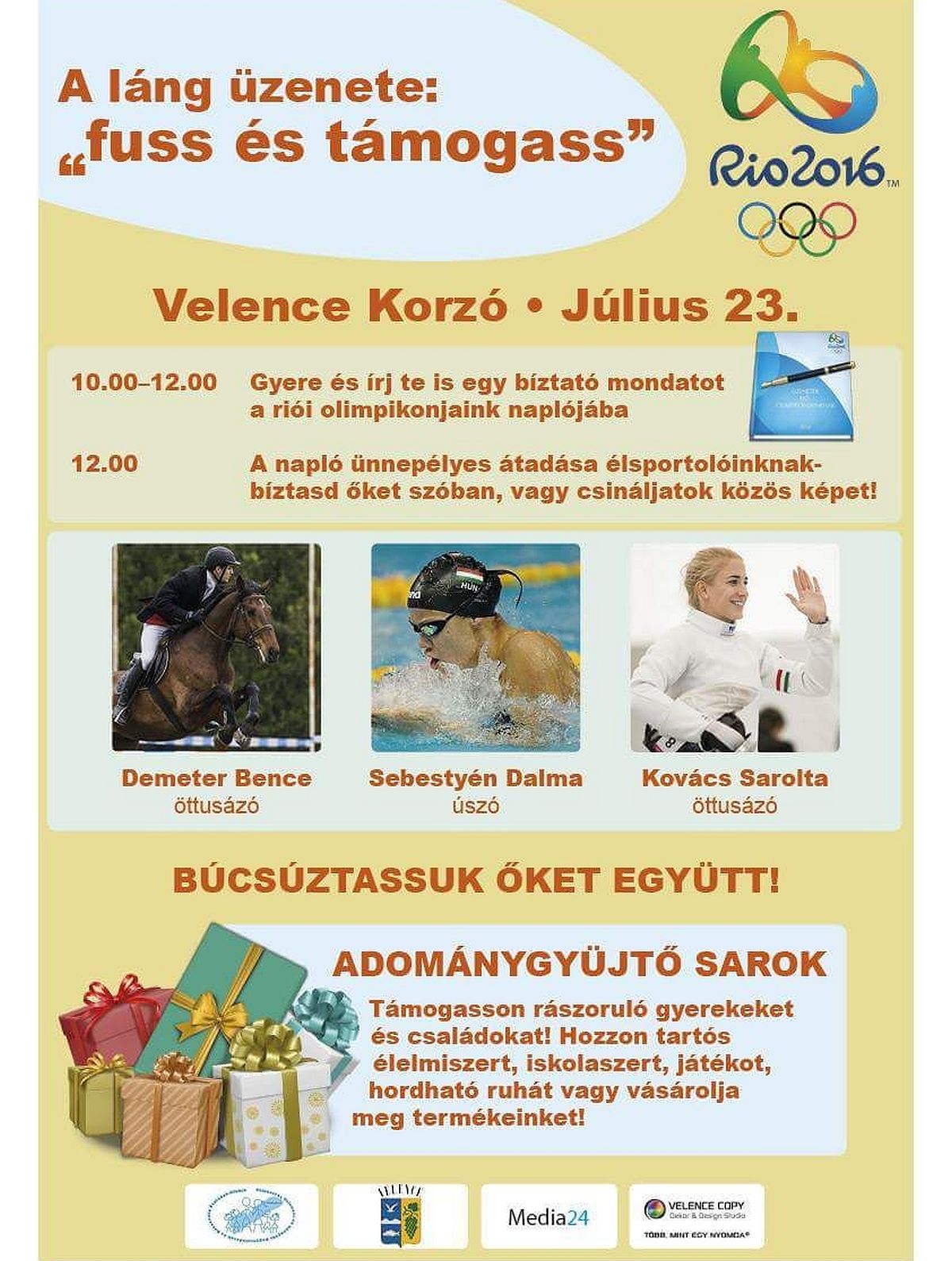 Hazánkban is egyre nagyobb izgalommal várják már a XXXI. nyári ötkarikás játékokat, ahol három székesfehérvári olimpikonért is szoríthatunk. Az elmúlt hetekben öt állomásból álló jótékonysági futással hangolódhattak a sportot kedvelők a riói olimpiára. A mozogni vágyók Velencén, Gárdonyban, Nadapon és Pusztaszabolcson teljesíthették Kovács István Mikulás nagykövettel együtt a 2016-os olimpia dátumát szimbolizáló 2016, vagy 216 méteres távot. A futások végén a gyerekek és a felnőttek külön kategóriában az olimpiai kvízen mérhették össze tudásukat, majd az olimpiai naplóba írhatták be jókívánságaikat a magyar sportolóknak a résztvevők, akik a fáklyával is fotózkodhattak.