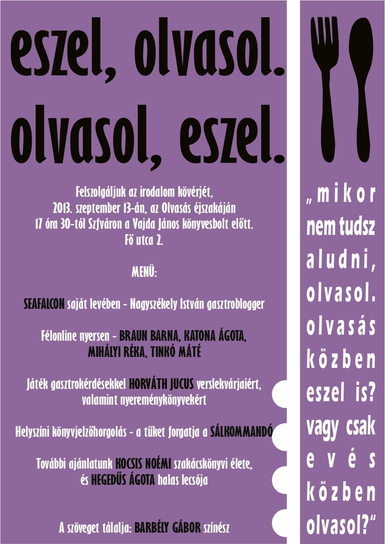 Székesfehérvár is csatlakozik az Olvasás éjszakája rendezvényhez. Szeptember 13-án pénteken 17.30 órakor a Vajda János könyvesbolt előtt kezdődnek a programok, amelyek a gasztronómia jegyében telnek. Az érdeklődők találkozhatnak Nagyszékely István gasztrobloggerrel és helyszíni könyvjelzőhorgoláson is részt vehetnek a Sálkommandóval.