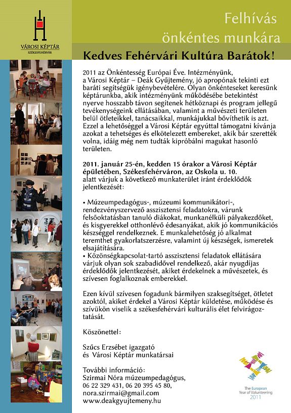 A Városi Képtár-Deák Gyűjtemény olyan önkénteseket keres, akik az intézmény működésébe betekintést nyerve hosszabb távon segítenek a hétköznapi tevékenységek ellátásában, valamint a művészeti területen belül ötleteikkel, munkájukkal bővíthetik is azt. Az önkénteseket január 25-én kedden 15 órakor várják a Városi Képtár épületében, az Oskola utca 10. szám alatt.