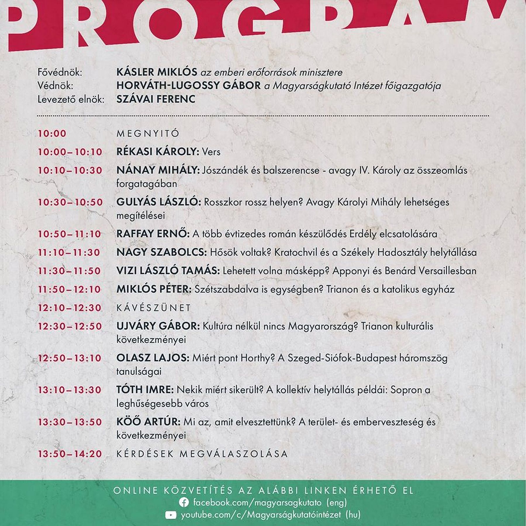 A békekötéshez kapcsolódó témákat – fókuszban Közép-Európa és Magyarország helyzetével – többek között Nánay Mihály, Gulyás László, Raffay Ernő, Nagy Szabolcs és Miklós Péter előadásai dolgozzák fel,