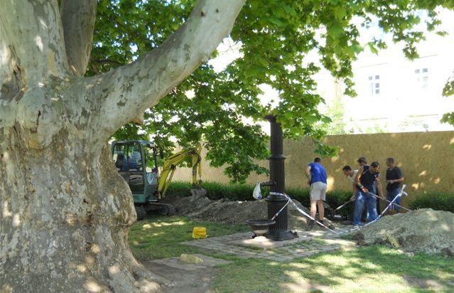 A Szent István tér parkrészének átvágását május 16-án óvatos kézi földmunkával kezdték meg a helyszínen dolgozó munkások. Nagy körültekintéssel igyekeztek a rendkívül száraz és kemény talajban a lehető legkisebb sebet ejteni a mintegy 150 éves helyi védettséget élvező platán (Platanus hispanica) gyökerein. A május 16-án kialakított munkagödörben, a hajszálgyökerek és a több kisebb 1-2 cm átmérőjű gyökér mellett, 3 db 4 cm átmérőjű gyökeret találtunk. A gyökérsérülések megtisztítása után megtörtént a sérült felületek sebkezelése. Május 17-én a díszkút mögötti térkővel borított terület kézi átfúrása is befejeződött. A gondos munkának köszönhetően minimális horzsolásos sérüléssel megúszták az ott talált 5 cm átmérőnél nagyobb gyökerek. A területen dolgozók óvatos munkájának, és kitartásának köszönhetően május 18-án hosszú fejtörés után sikerült megoldani a gyökerek között a csövek átvezetését.