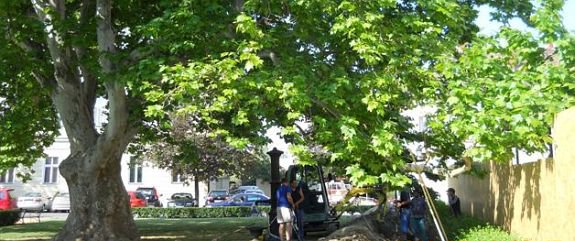 Nagy körültekintéssel igyekeztek a rendkívül száraz és kemény talajban a lehető legkisebb sebet ejteni a kb. 150 éves helyi védettséget élvező platán (Platanus hispanica) gyökerein. A május 16-án kialakított munkagödörben, a hajszálgyökerek és a több kisebb 1-2 cm átmérőjű gyökér mellett, 3 db 4 cm átmérőjű gyökeret találtunk. A gyökérsérülések megtisztítása után megtörtént a sérült felületek sebkezelése. Május 17-én a díszkút mögötti térkővel borított terület kézi átfúrása is befejeződött.