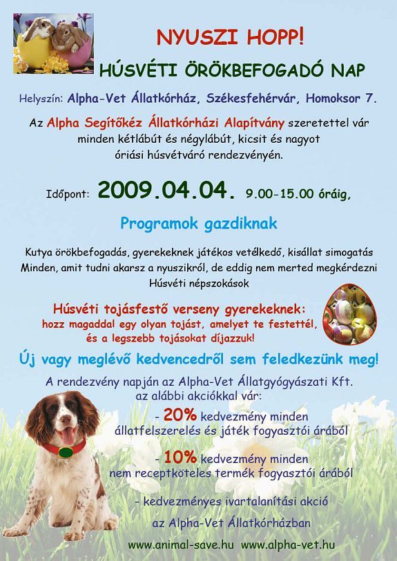 Az Alpha Segítőkéz Állatkórházi Alapítvány szeretettel vár mindnkit húsvéti örökbefogadó napján, április 4-én reggel kilenc és délután három óra között a Homoksoron található Állatkórházban. A kisállat simogatás mellett hasznos tanácsokat kaphatnak a látogatók a nyúltartással kapcsolatban és lehetőség lesz gazdátlan kutyák örökbefogadására is. A rendezvény napján minden állatfelszerelés és játék 20 százalékkal olcsóbb lesz az Állatkórház boltjában.