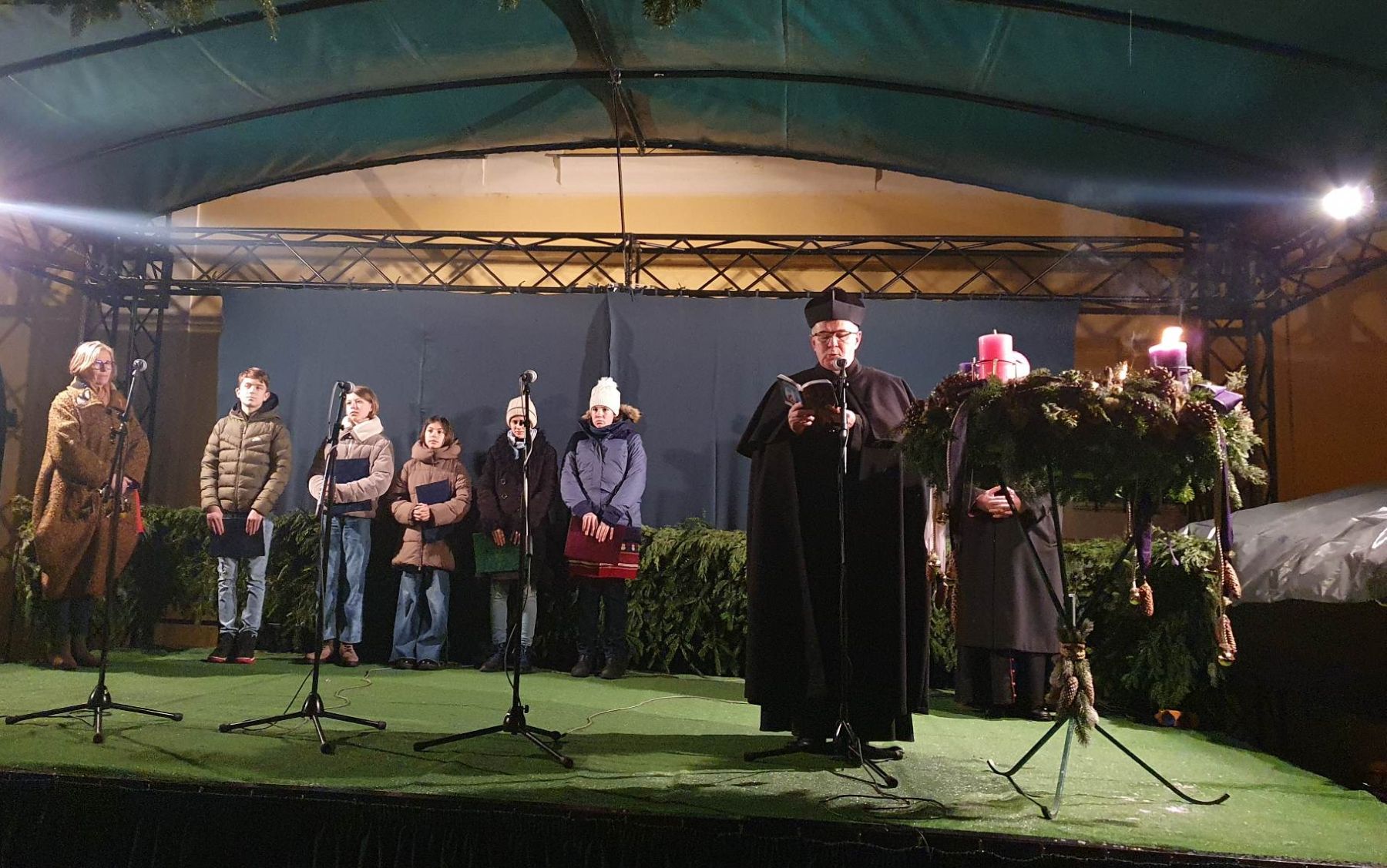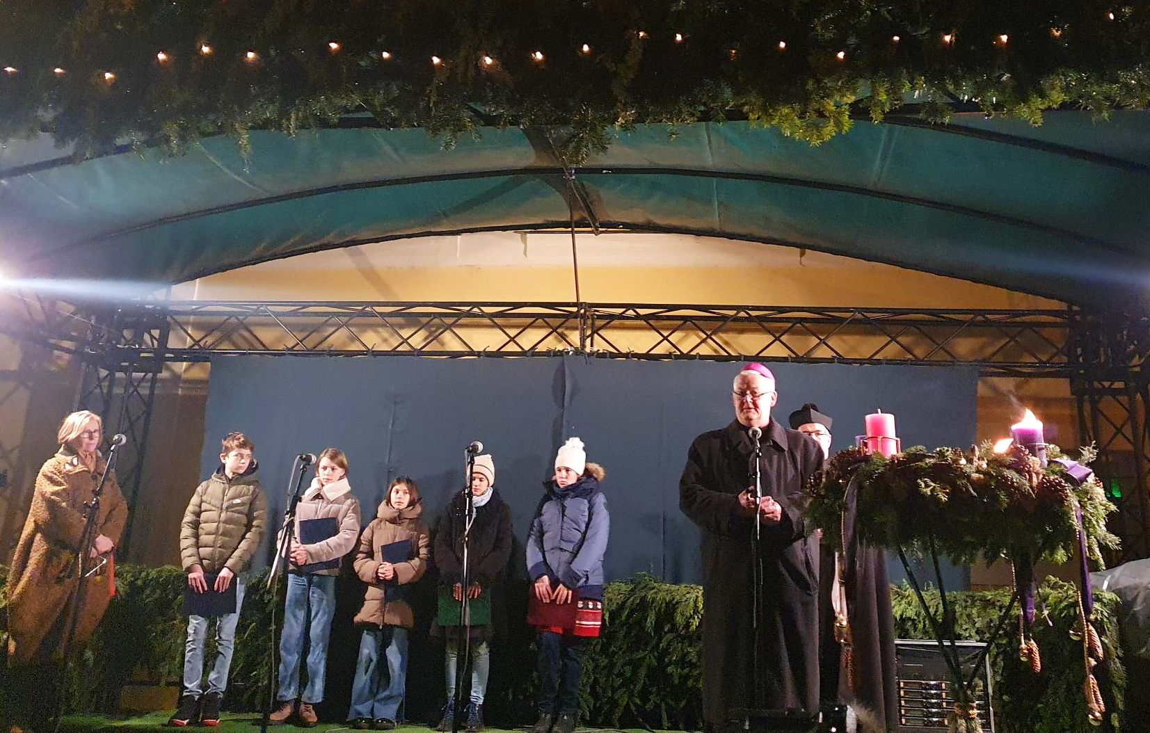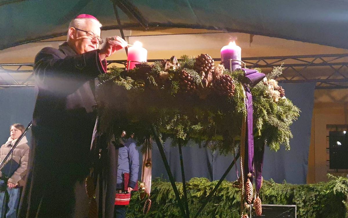 A Püspökség udvarán felállított színpadon Ugrits Tamás, irodaigazgató, pasztorális püspöki helynök köszöntötte a harmadik gyertyagyújtására érkezőket, majd az evangéliumból olvasott fel a budakeszi Prohászka Ottokár Gimnázium diákjainak ünnepi műsorát követően. Ezután Spányi Antal, püspök mondta el adventi gondolatait és gyújtotta meg a harmadik, rózsaszínű gyertyát az adventi koszorún.