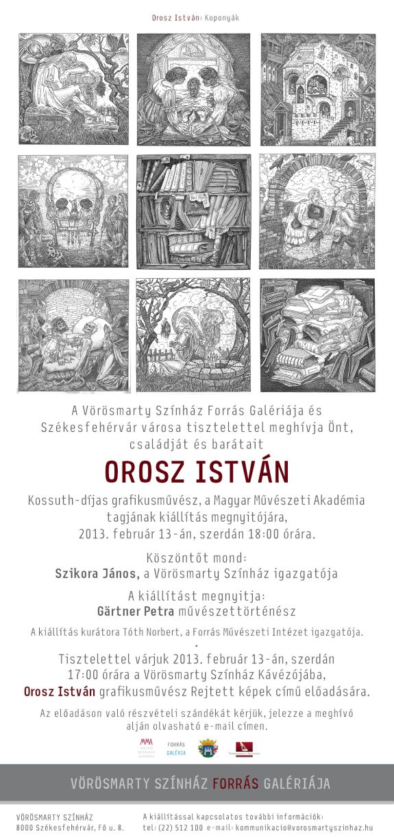 Orosz István Kossuth-díjas grafikusművész, a Magyar Művészeti Akadémia tagjának kiállítása nyílik meg február 13-án szerdán 18 órakor a Vörösmarty Színház Forrás Galériájában. A kiállításmegnyitón köszöntőt mond Szikora János, a Vörösmarty Színház igazgatója, a tárlatot Gärtner Petra művészettröténész ajánlja a látogatók figyelmébe. A tárlatnyitó előtt, 17 órakor Orosz István Rejtett képek című előadására kerül sor a színház kávézójában.