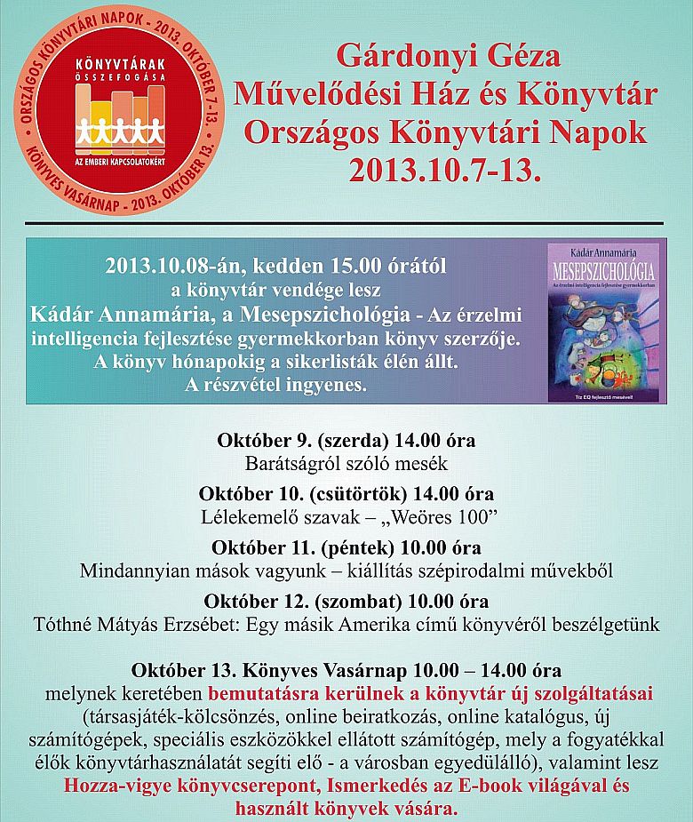 A Gárdonyi Géza Művelődési Ház és Könyvtár vendége lesz október 8-án, kedden Kádár Annamária mesepszichológus és pénteken kiállítás nyílik a Szent Kristóf Ház alkotóinak munkáiból. Adorján Viktor igazgató felhívta a figyelmet a könyvtár új szolgáltatásaira is. „ A Könyves Vasárnap keretében bemutatjuk az újdonságokat is. Az olvasóknak lehetőségük nyílik az online beiratkozásra, és az online katalógus használatára, valamint egy pályázatnak köszönhetően igénybe vehetik azt az új, speciális eszközökkel ellátott számítógépet, amely a fogyatékkal élők könyvtárhasználatát elősegíti.” Lesz hozza-vigye könyvcsere és lehetőség nyílik megismerni az E-book világát is.