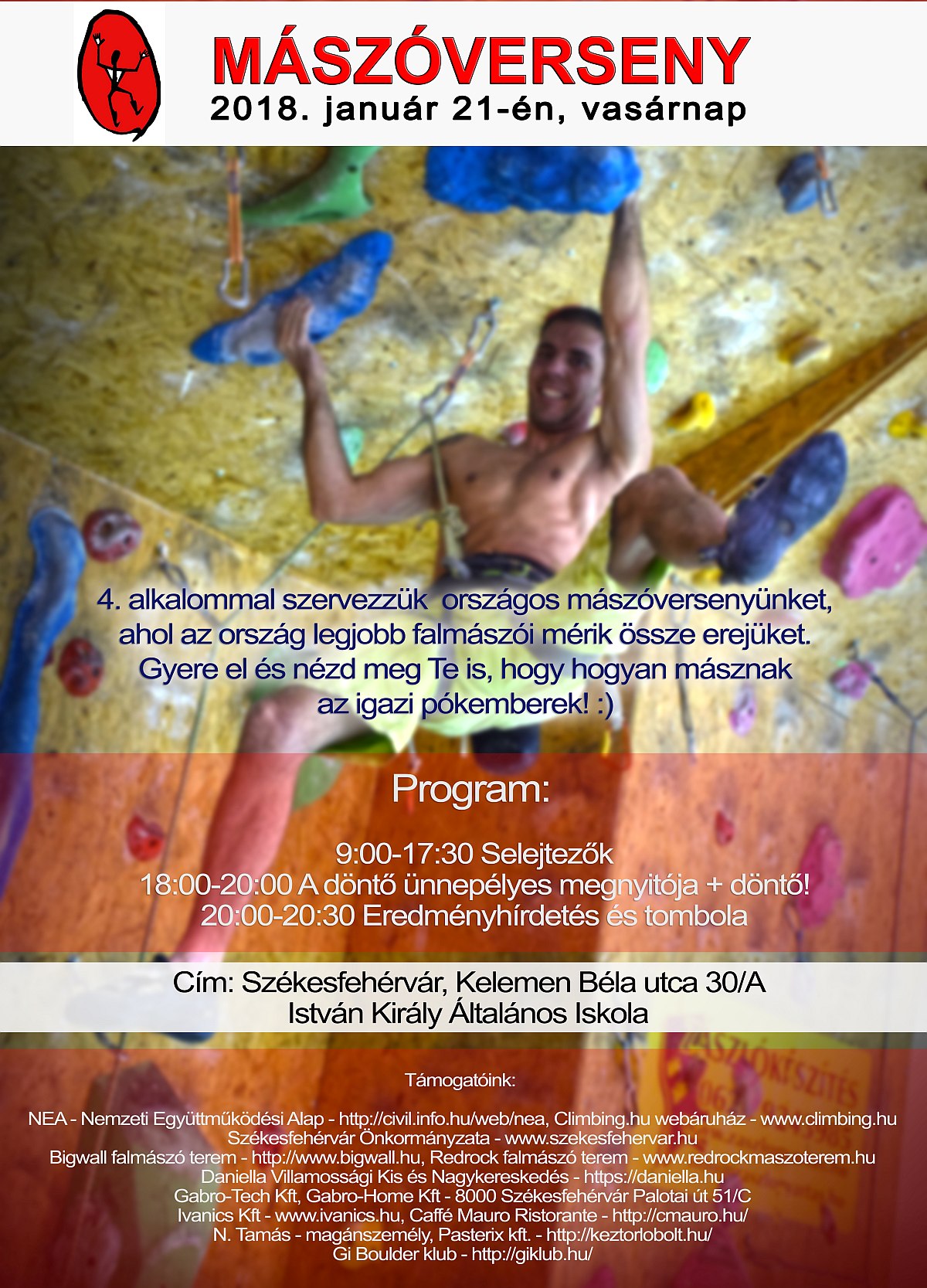 Országos mászóversenyt rendeznek január 21-én, vasárnap az István Király Általános Iskolában az ország legjobb falmászóival. A 4. Rotpunkt Nehézségi Falmászó Verseny 9 órától este 20.30 óráig zajlik majd, délelőttől a selejtezőkkel hat kategóriában, majd este 18 órától a döntőkkel. Az eredményhirdetést 20 órára tervezik.