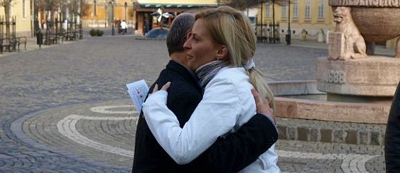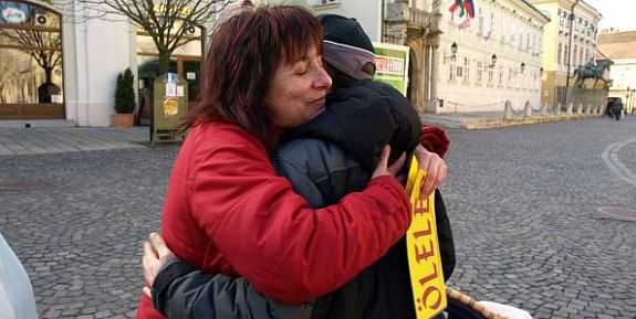 Egy „Ingyen ölelés” táblácskával is igyekezett felhívni a figyelmet a Mosolyogj Mozgalom akciójája. A legtöbben a mosolyt mosollyal viszonozva érdeklődéssel vették el a szórólapot és készséggel meg is ölelték egymást az emberek a Városház téren.