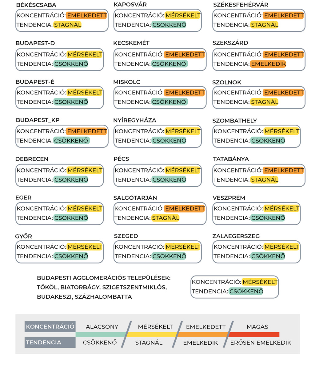 A városok döntő többségében - 16 mintavételi helyen - csökkenő tendencia jellemző, míg Békéscsabán, Salgótarjánban, Székesfehérváron, Szolnokon és Tatabányán stagnálás tapasztalható. Emelkedés egyedül Szekszárd esetében figyelhető meg.