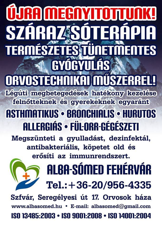 A légúti betegségek leghatékonyabb természetes kezelési módszere a sóbánya. Ez az évszázadok óta ismert kezelési módszer egy orvosi műszer segítségével már Székesfehérváron is elérhető. Az Orvosok Házában megnyitotta kapuit az Orvosi Sóterápiás Rendelő. A száraz sóterápia számos légúti betegséget (asztma, allergia, krupp, bronchitis, COPD, fül-orr-gégészeti) előz meg és kezel magas hatásfokkal, erősíti az immunrendszert és a szervezet önregeneráló képességét.